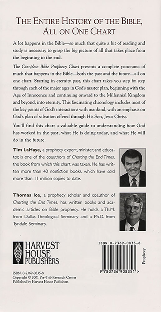 A panorama of the ages on one full-color master chart created by prophecy experts Tim LaHaye and Thomas Ice! Beginning with eternity past and looking all the way to the prophetic future, LaHaye and Ice provide a compelling overview of the key points and events described in Bible history.