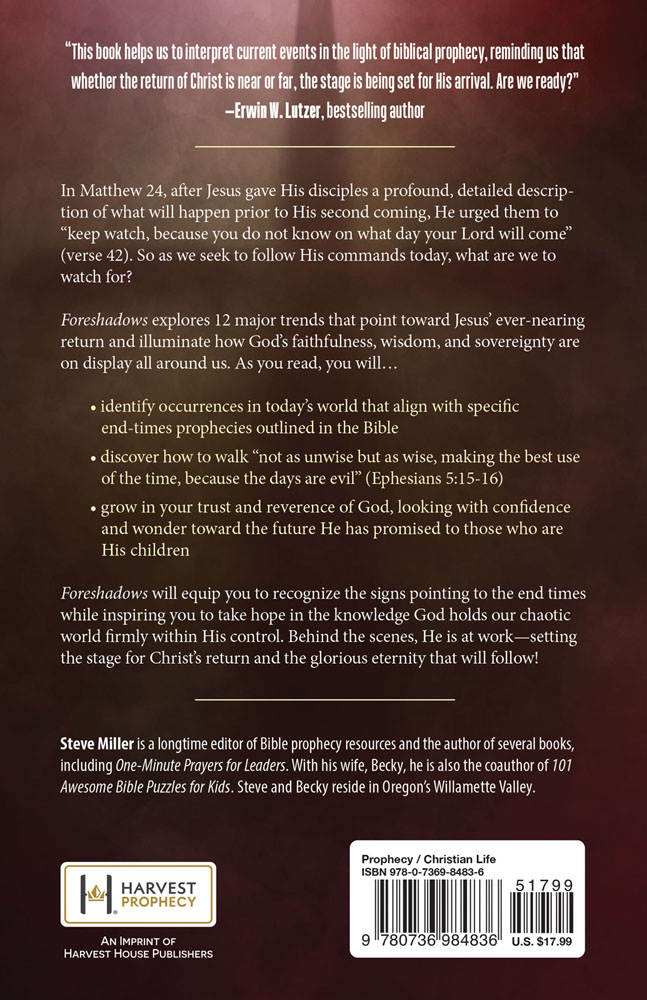 Foreshadows will equip you to recognize the signs pointing to the end times while inspiring you to take hope in the knowledge God holds our chaotic world firmly within His control. Behind the scenes, He is at work—setting the stage for Christ’s return and the glorious eternity that will follow!